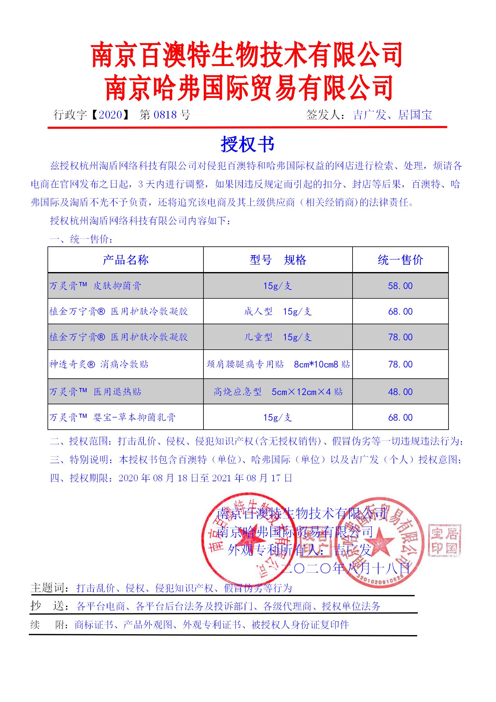 公司授权委托杭州淘盾网络科技有限公司为线上维权、维价合作方
